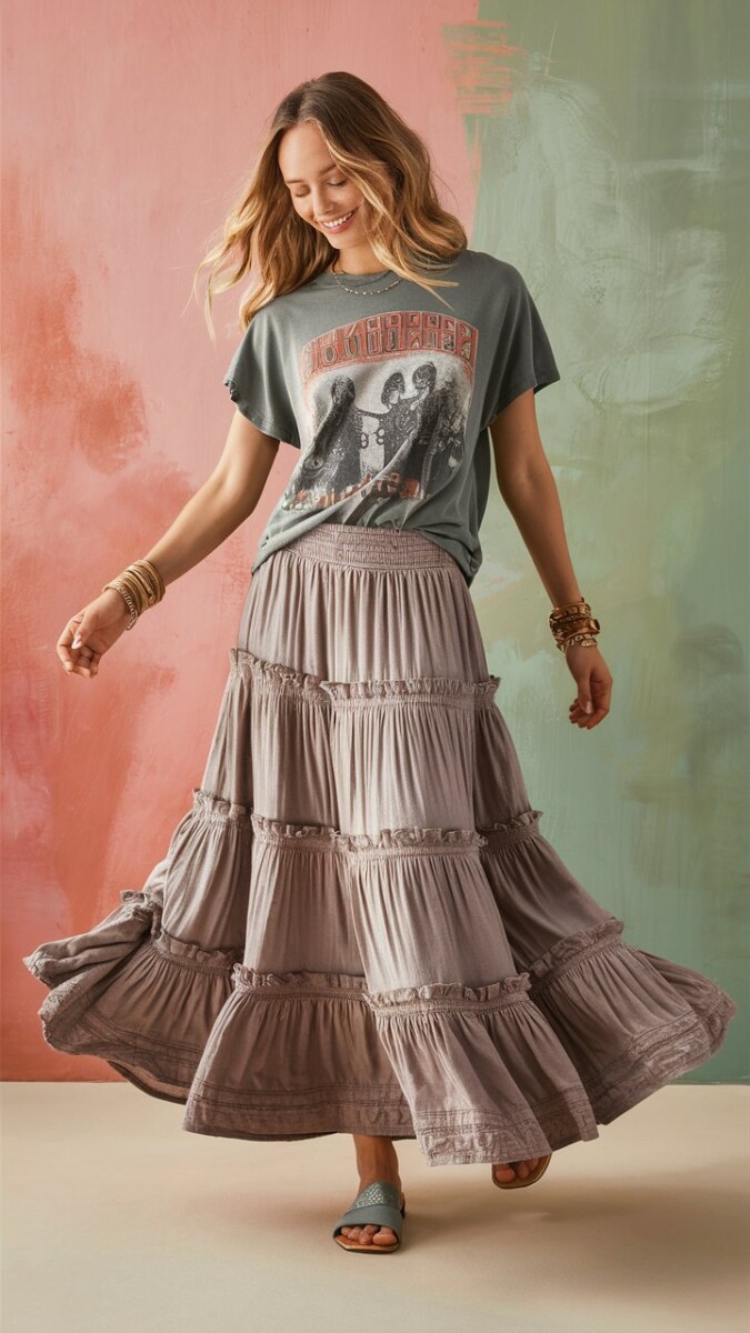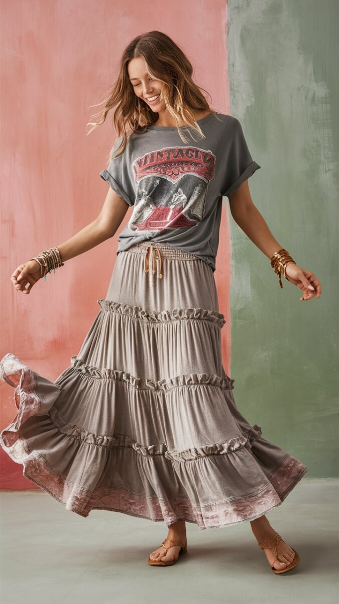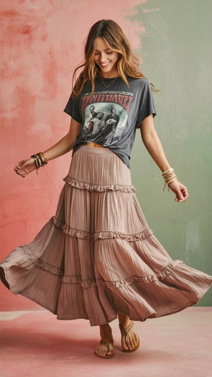 Mix romantic and rebellious elements by pairing a flowy tiered skirt with a vintage-style graphic tee. Choose a maxi or midi skirt with ruffles, eyelet detailing, or ethnic prints, and tuck a faded band tee loosely into the waistband. Knotting the shirt at the waist can also create a flattering silhouette.