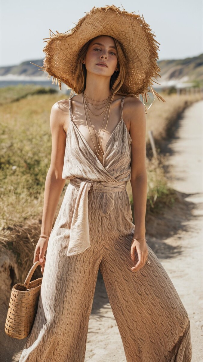 Top off the look with a wide-brimmed hat, some long necklaces, and a pair of espadrilles or platform sandals. Woven bags and colorful bangles complete this effortlessly cool ensemble that’s as comfortable as it is chic.