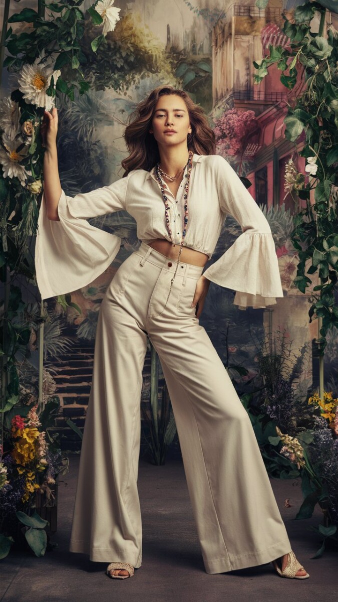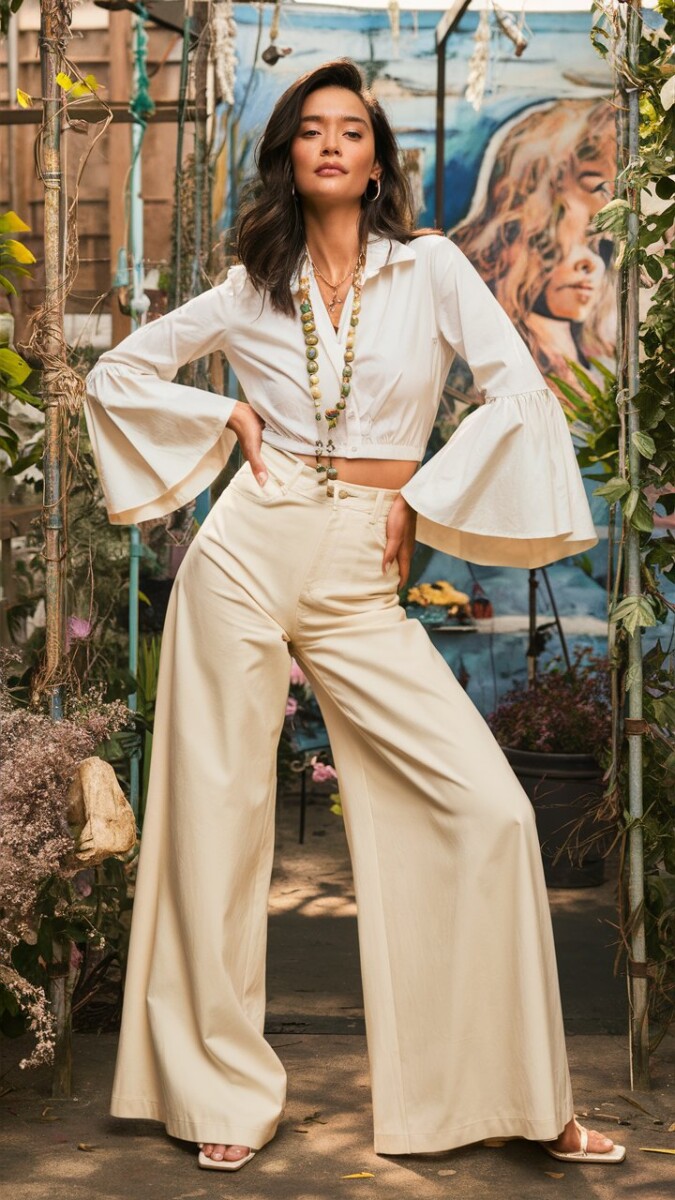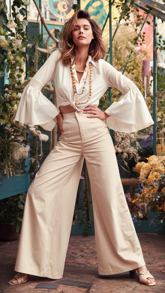 Statement sleeves are a signature element of boho fashion. Choose a bell-sleeve or flared-sleeve blouse in light, breathable fabrics, and pair it with high-waisted wide-leg pants or palazzo trousers. The wider the silhouette, the better for achieving that dreamy, relaxed vibe.