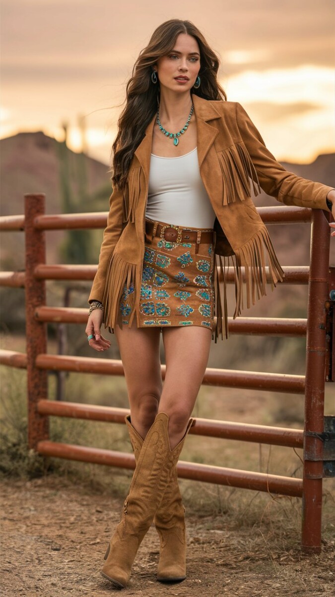 When you want a more structured boho look, combine a suede jacket with an embroidered mini skirt. Choose a skirt with intricate stitching, tribal prints, or delicate embroidery, and balance it with a classic tan or brown suede jacket, preferably with fringe details. Underneath, a simple fitted top works best.