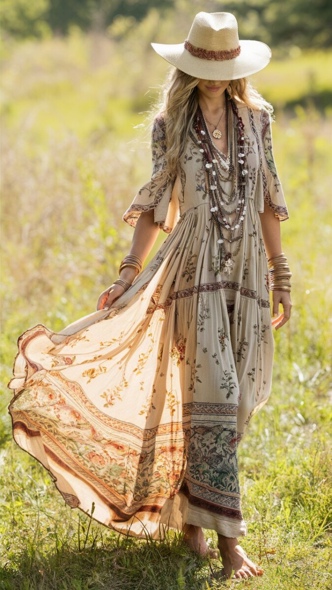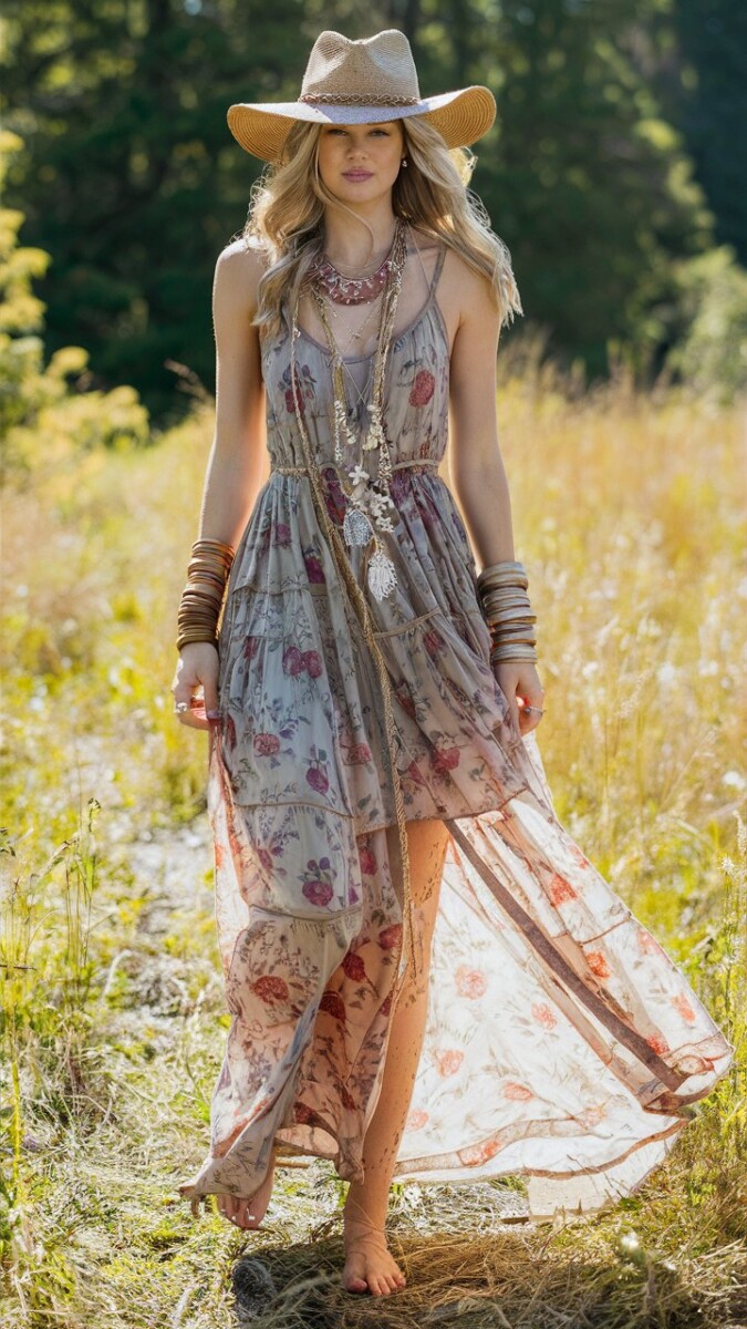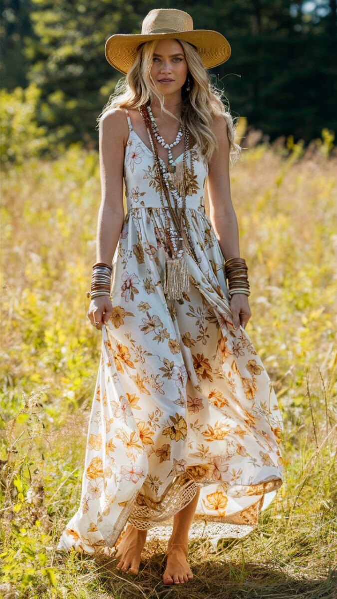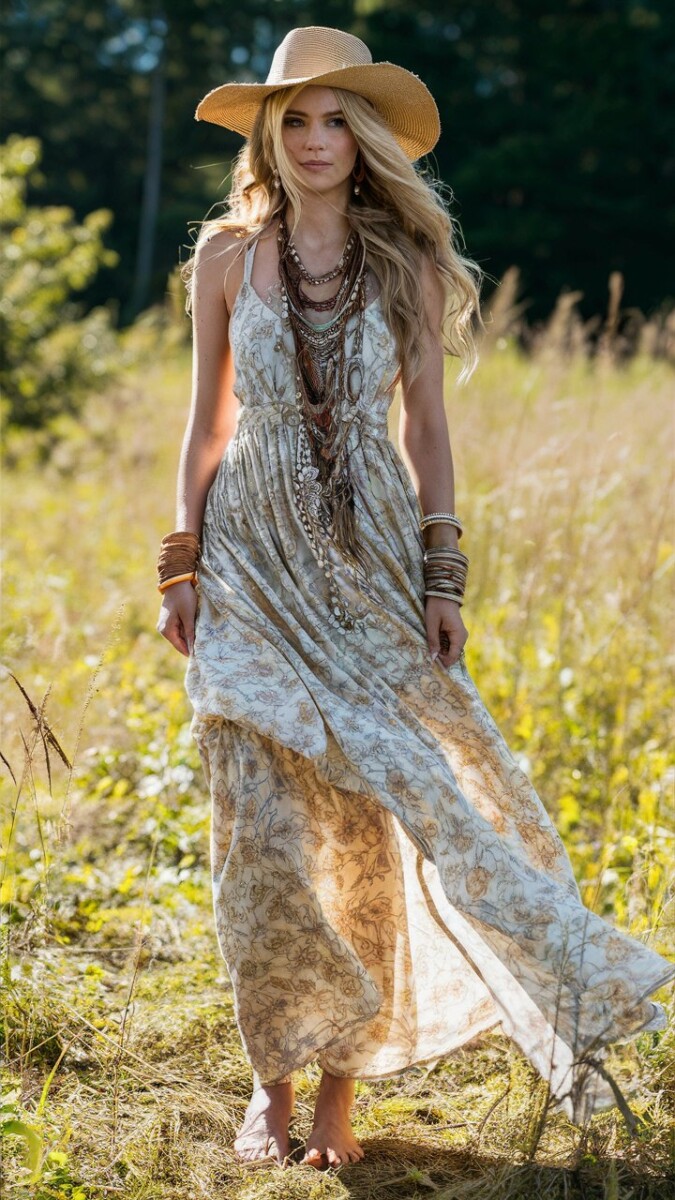 Go for earthy or pastel shades and add touches of artisanal accessories like beaded belts or handmade jewelry. Sandals or barefoot walks through the grass will complete this peaceful, nature-loving look.