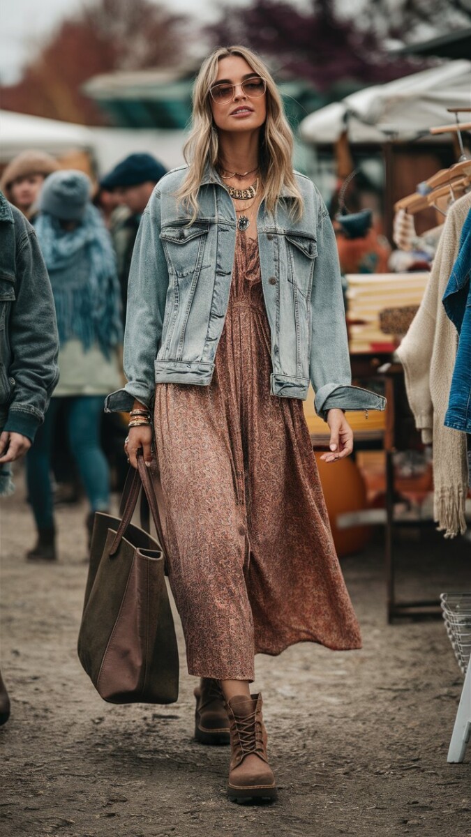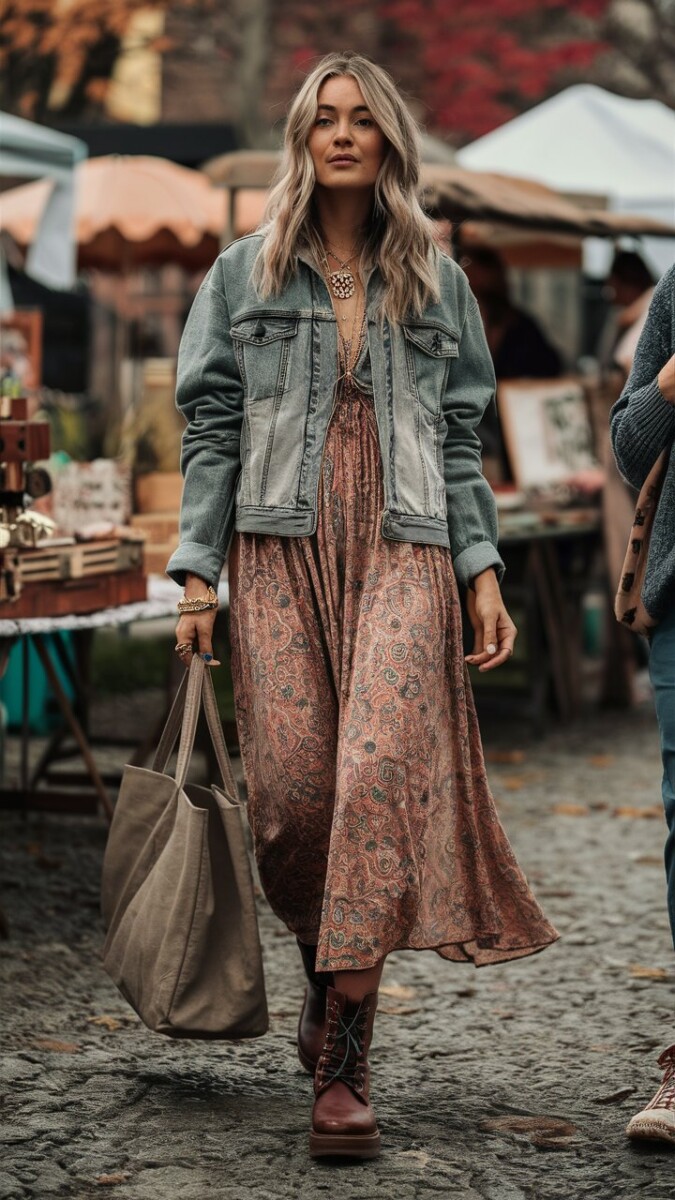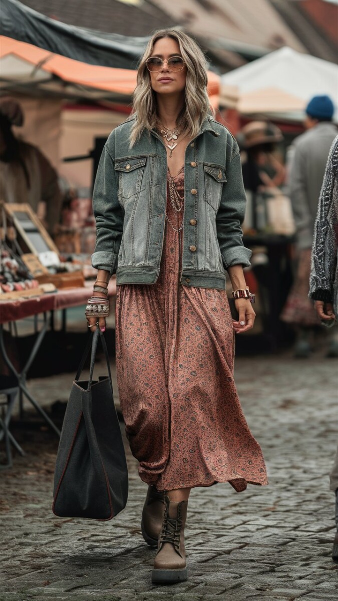 Combine rugged and romantic elements by layering a vintage-style denim jacket over a soft, flowy midi dress. This outfit strikes a perfect balance between edgy and feminine, making it incredibly versatile. Opt for a midi dress with soft prints, embroidery, or subtle ruffles, and pair it with a slightly oversized, faded denim jacket.