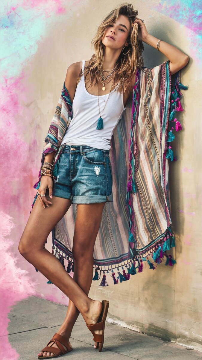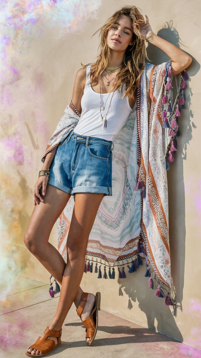 Transform even the simplest outfits by adding a statement kimono. Layer a printed, flowing kimono over a basic tank top and denim shorts or skinny jeans. Choose kimonos with boho prints such as florals, paisleys, mandalas, or tie-dye.