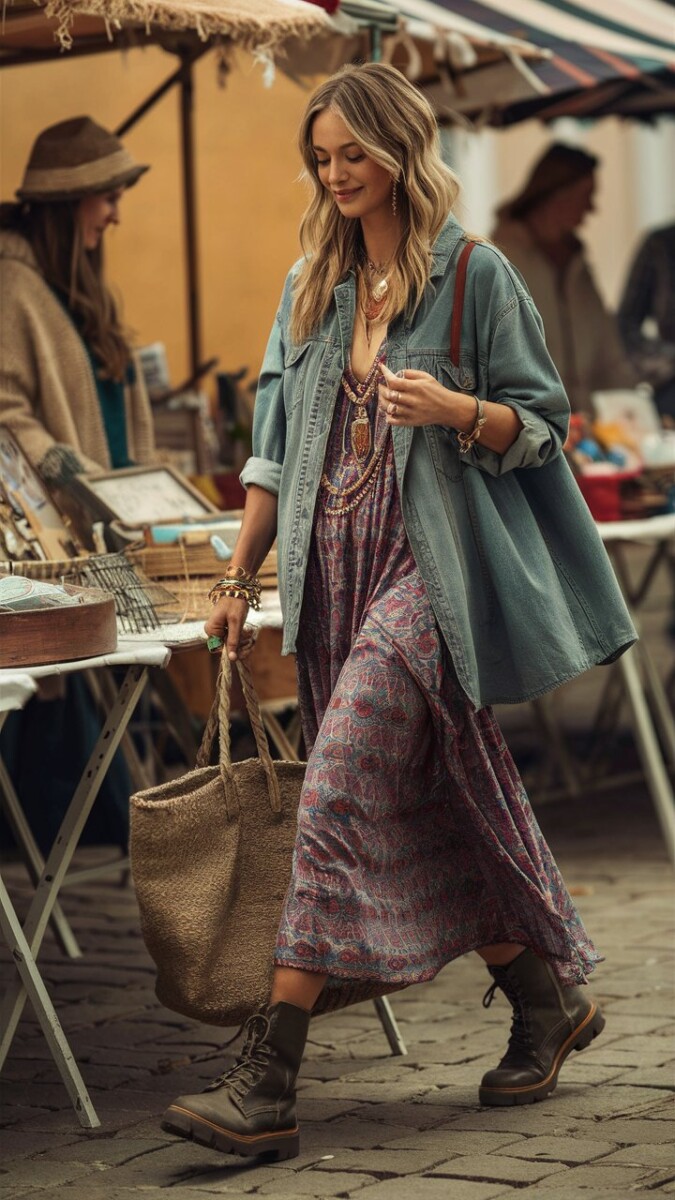 Style the look with chunky boots, layered necklaces, and a slouchy bag. This outfit easily transitions from spring to fall, making it a timeless addition to any boho wardrobe.