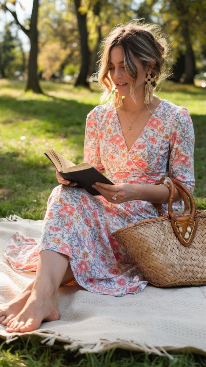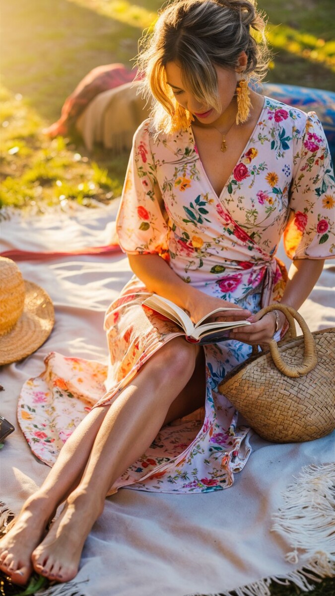 The wrap dress is universally flattering and a favorite in boho fashion for its soft, flowing silhouette. Pick one in muted earth tones or dreamy prints like florals, mandalas, or tie-dye. Keep accessories natural with woven handbags, raffia belts, and macrame jewelry.