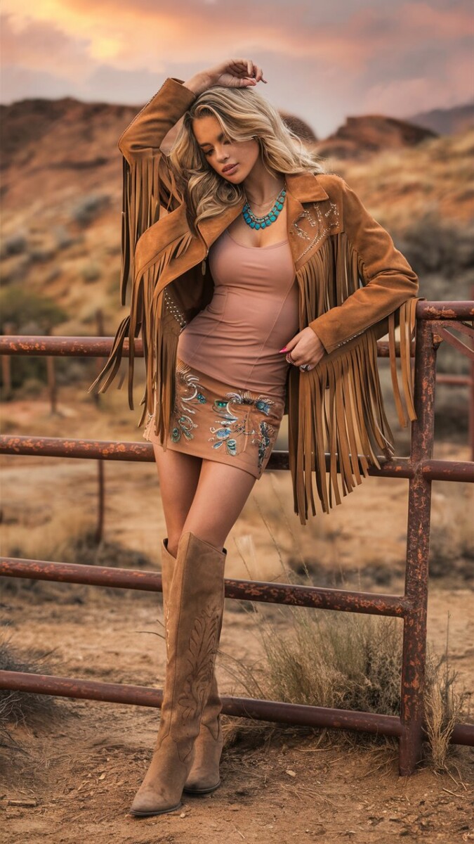 Finish off the look with knee-high boots or chunky ankle boots, a fringed crossbody bag, and a few silver or turquoise jewelry pieces for that authentic wanderlust touch.