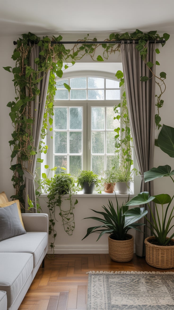 Let nature frame your space by allowing trailing plants to spill over curtain rods or windowsills. Devil’s ivy or philodendron can be trained to wrap around rods or hooks. It softens sharp edges and brings an effortlessly wild touch to your living room.