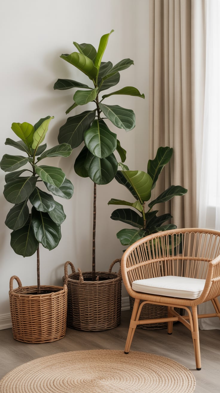 Go big with dramatic, sculptural plants like fiddle leaf figs, rubber trees, or monstera deliciosa. Place them in natural-toned baskets or clay pots and position them in room corners or next to a rattan chair. These oversized beauties double as living art and instantly anchor your boho aesthetic.