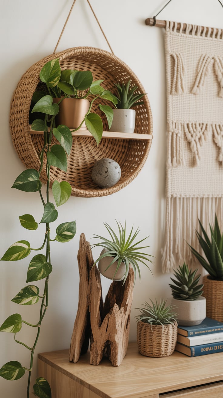 Incorporate greenery into your existing boho décor. Let a pothos trail from a woven wall shelf, place an air plant on a driftwood sculpture, or tuck small planters among your books and tapestries. Plants don’t need to stand alone—integrate them into the full design story of your room.