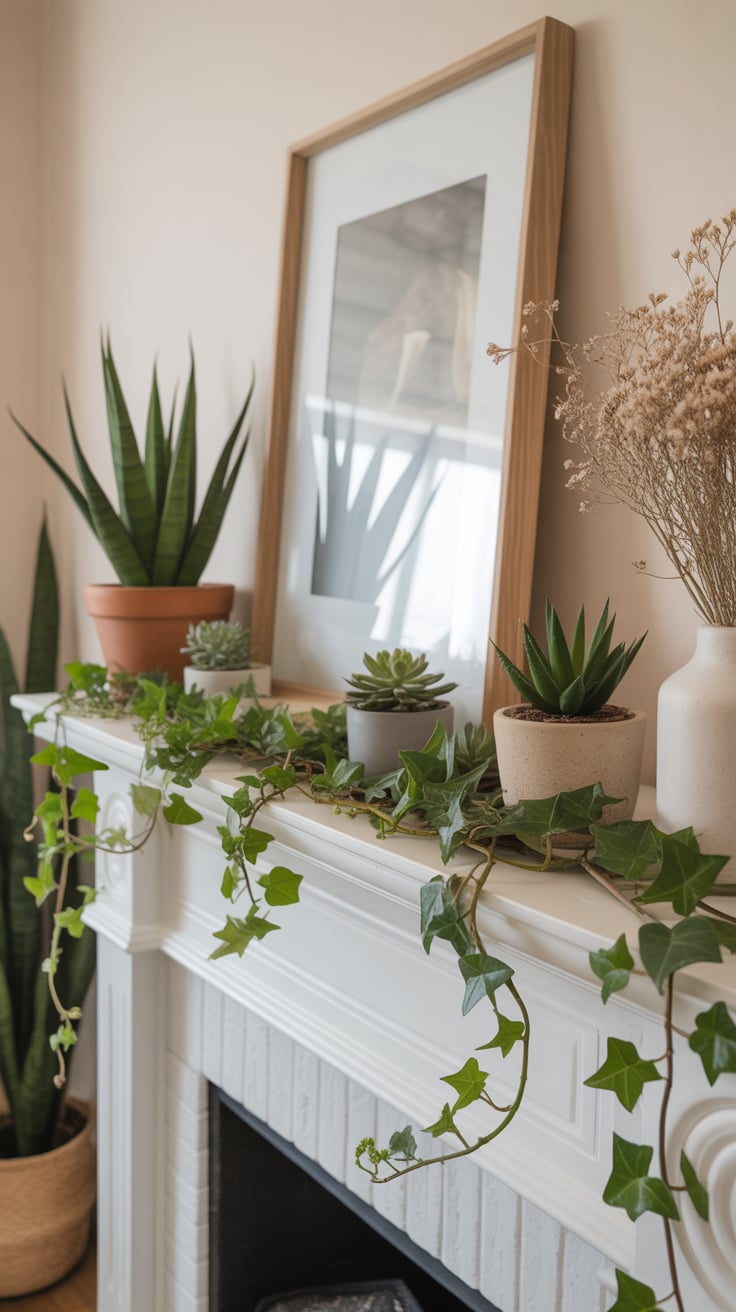 If you have a fireplace mantel, line it with trailing greenery like English ivy or burro’s tail mixed with small potted succulents or dried florals. Swap in seasonal plants or accents to keep the display feeling fresh and intentional all year round.