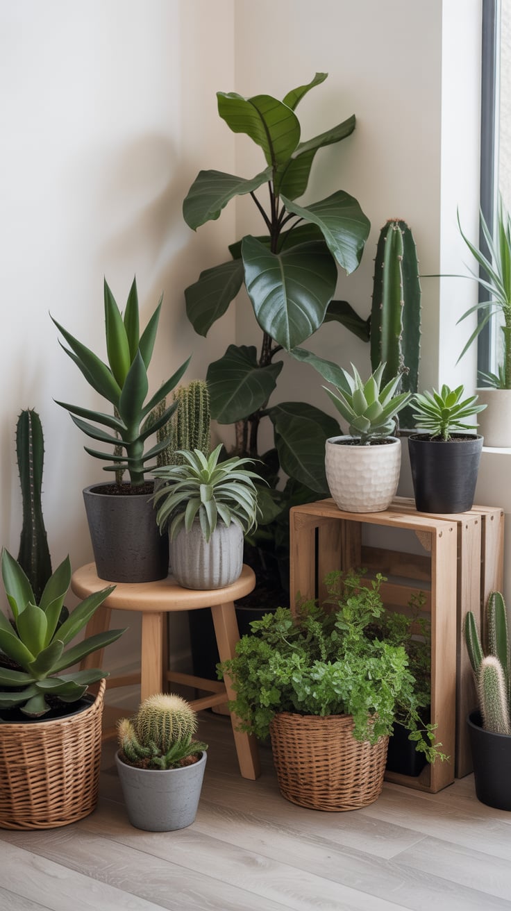Create a lush plant corner by clustering various-sized plants together. Combine leafy greens, succulents, and even cactus for textural contrast. Use stools, crates, and plant stands at different heights to build a tiered arrangement that feels natural and spontaneous—like your own personal jungle nook.