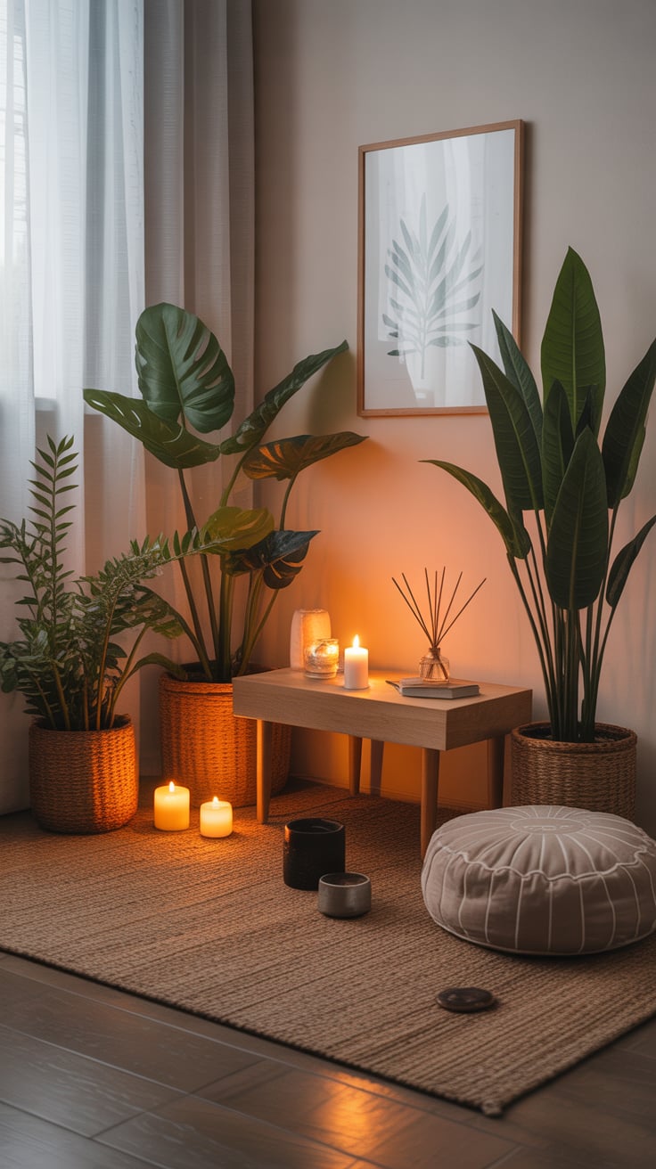 Dedicate a small corner to serenity with plants, candles, incense, and perhaps a cushion or pouf. Use leafy greenery to define the space, adding calming energy and grounding vibes. It becomes not only a decor statement but a peaceful escape right in your living room.