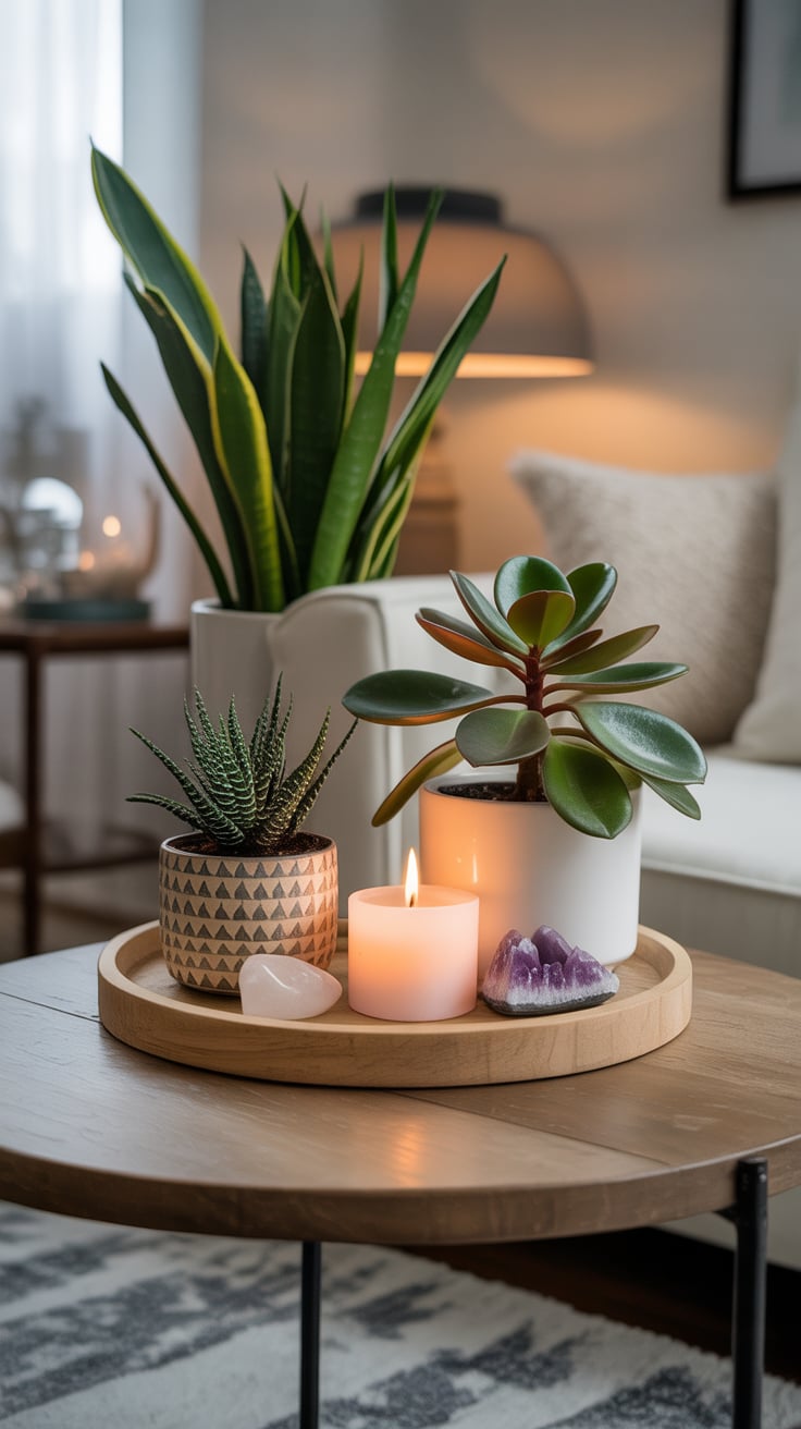 Add personality to coffee tables or side tables with small plants like peperomia, baby rubber plants, or mini ferns. Pair them with crystals, candles, or handmade ceramics to create thoughtful, boho-inspired vignettes.