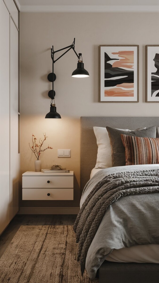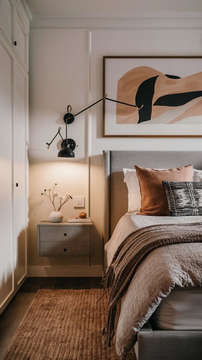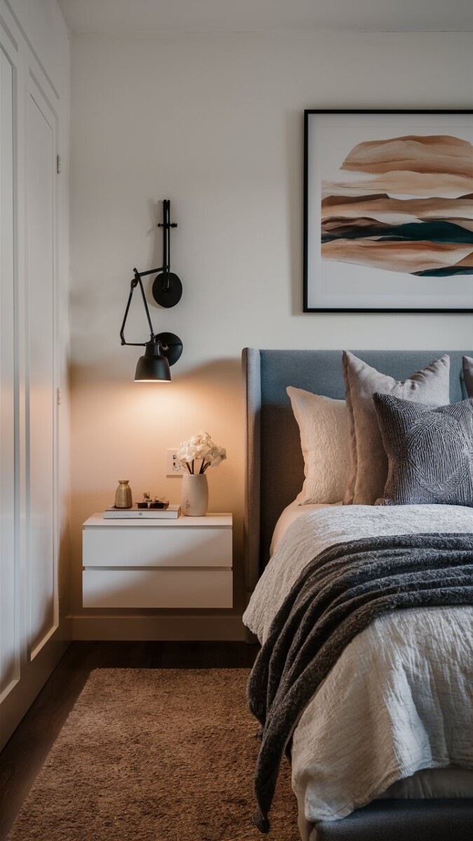 When floor space is limited, think vertical. Install floating shelves, tall bookcases, or even vertical pegboards to store and display items. Wall-mounted lighting (like sconces) can also free up nightstand space. By taking advantage of your walls, you create storage and visual interest without sacrificing any square footage.