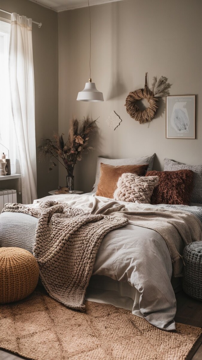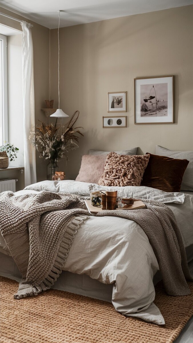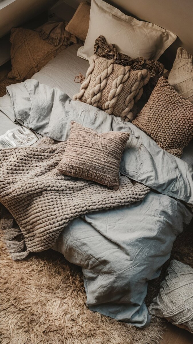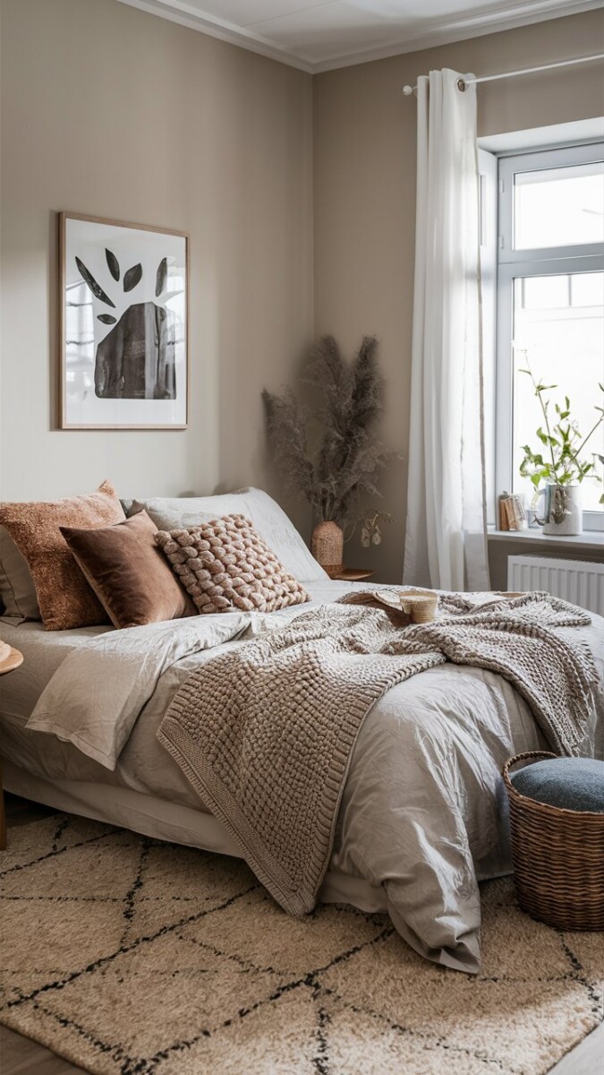 When you don’t have space for décor items, use soft furnishings to add warmth and style. A chunky knit throw, textured cushions, or a layered rug can make a small bedroom feel more inviting without taking up room.