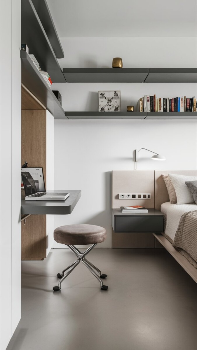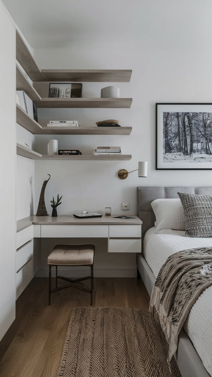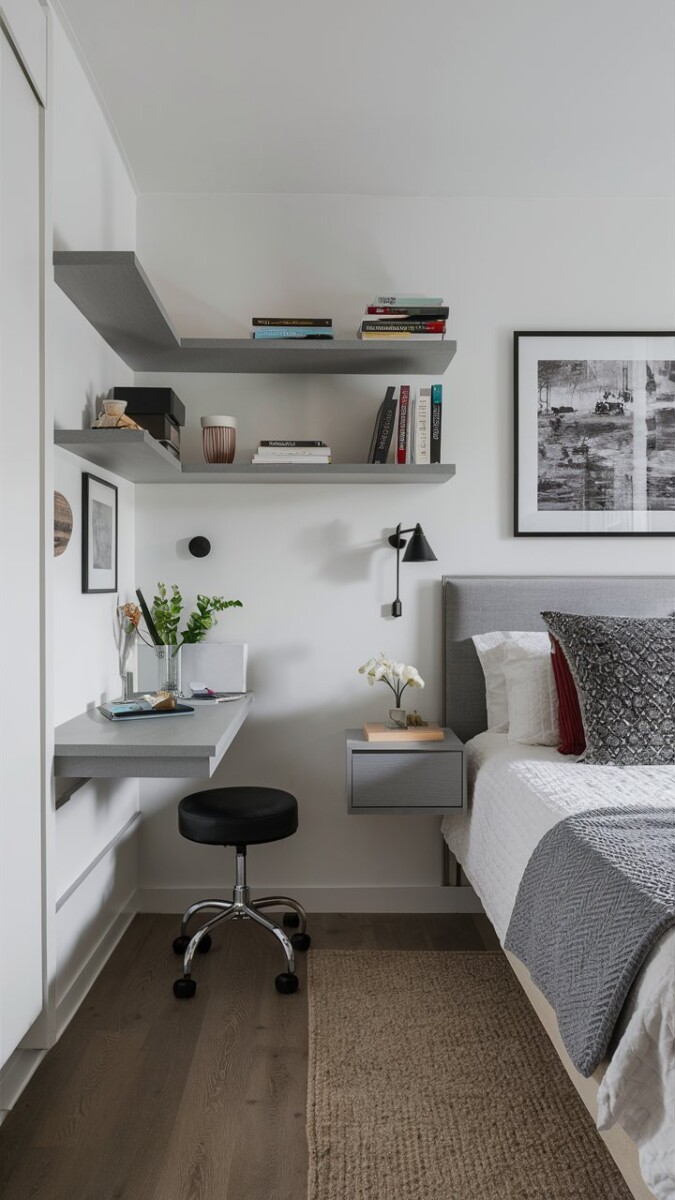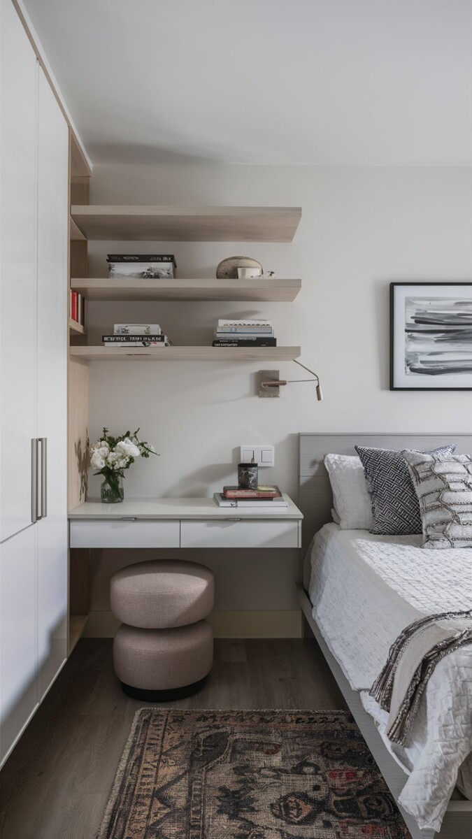 Floating desks, vanities, and shelves give the illusion of more space by lifting items off the floor. They’re modern, functional, and perfect for small bedrooms. Paired with a stool that tucks away neatly, floating furniture helps maintain a clean and open floor plan.
